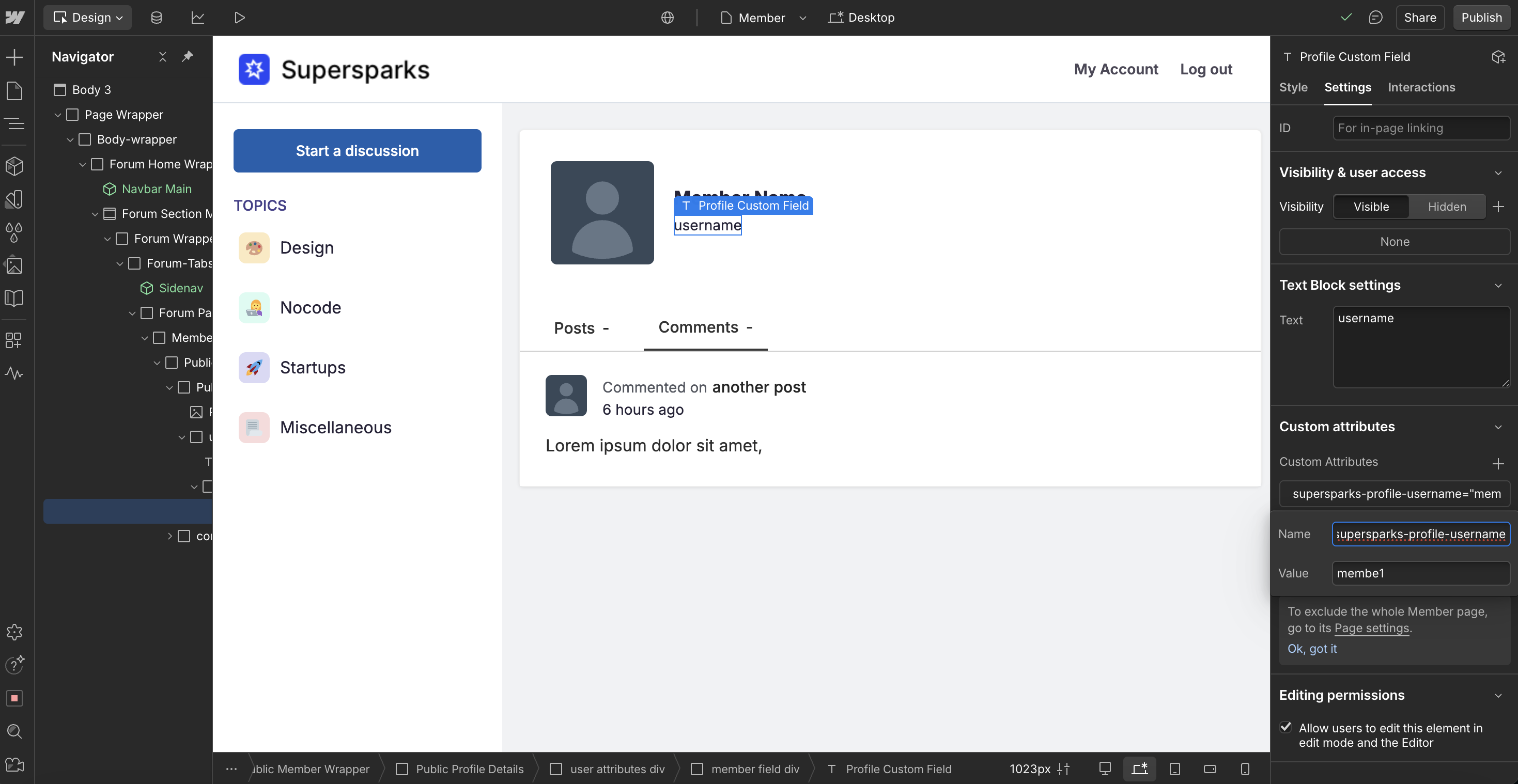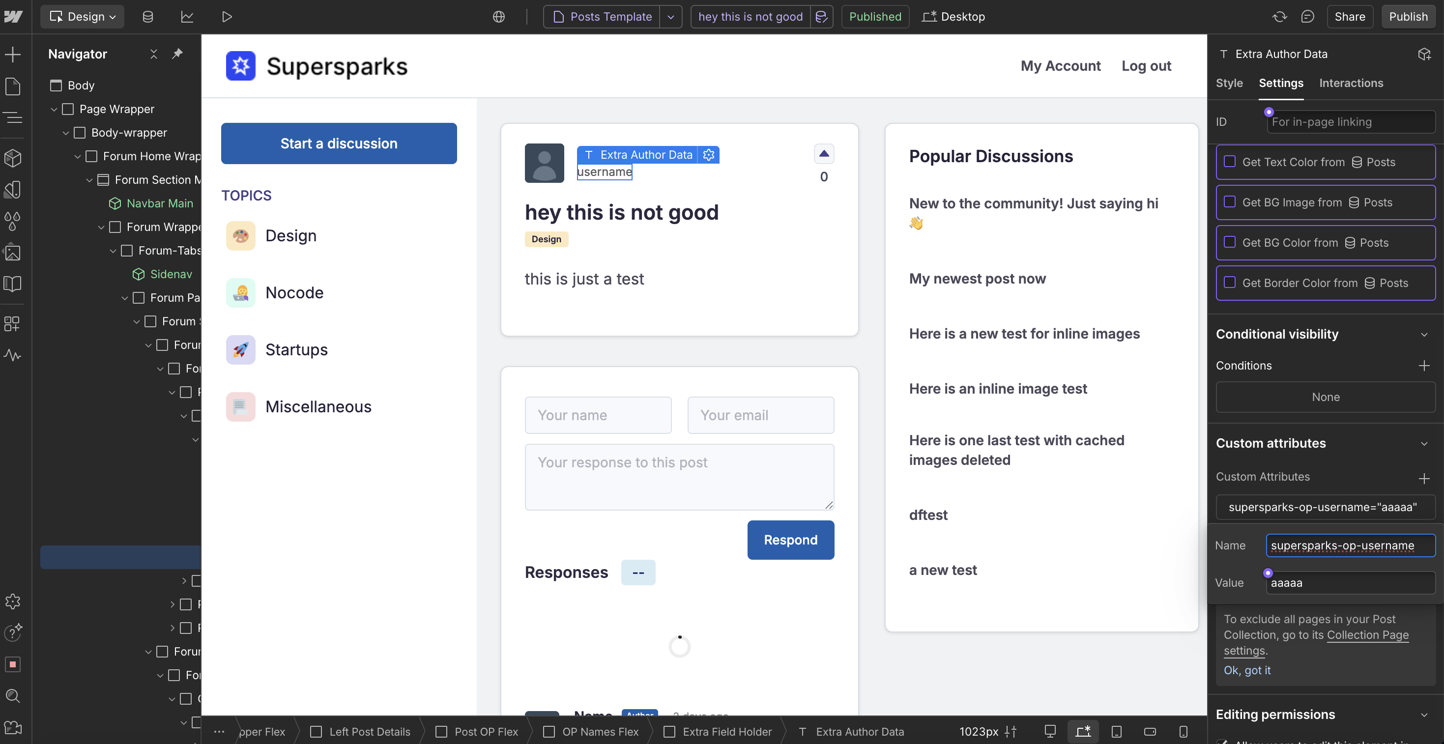 To display the username field with community post author details, you can add a text element to the the collection template page and any collection list element for displaying post author details. Then, be sure to paste the attribute provided in the editor section for the custom field to this new text element - the attribute value will always be the unique 5-digit code for the spark (eg. supersparks-op-field-1 = aaaaa in the below example).
