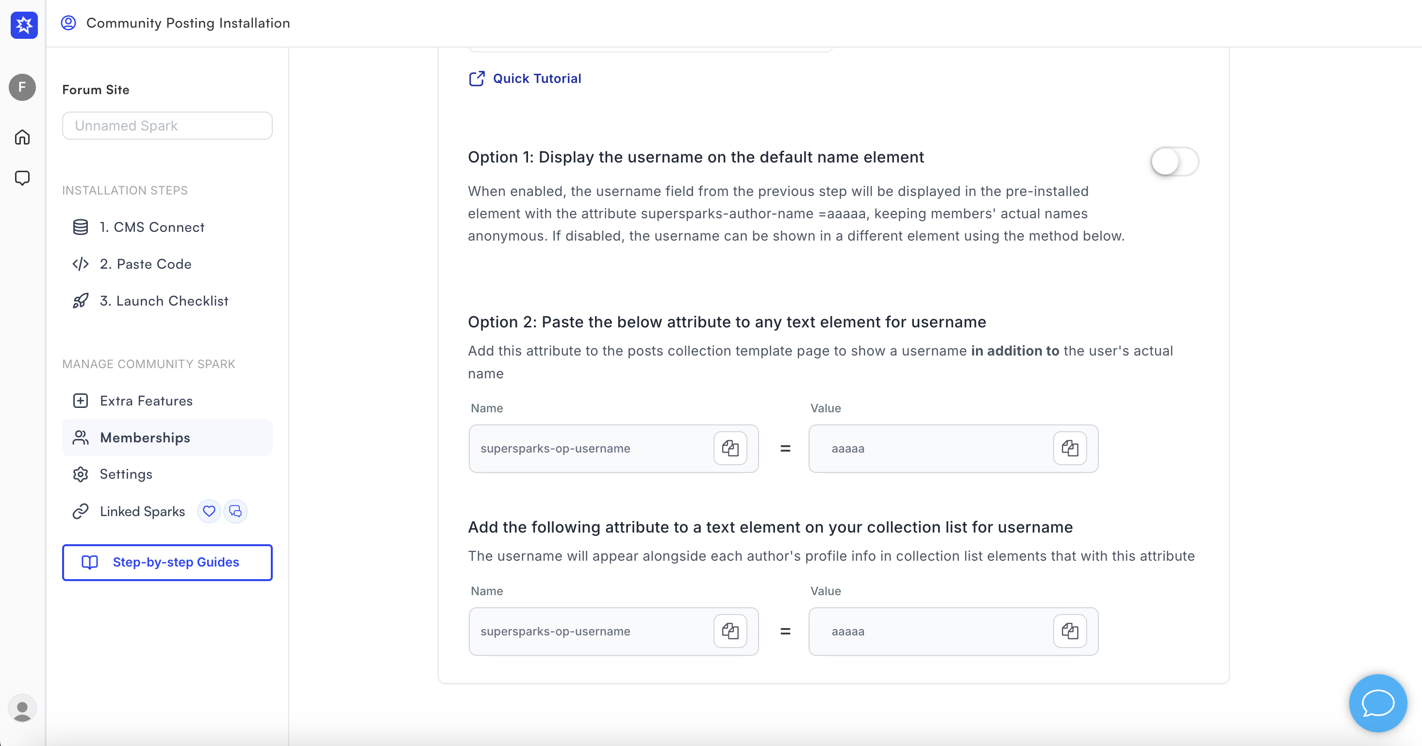 To display members' username with reviews and comments, you first need to add a text element to the comment cards in Webflow. Then, be sure to paste the attribute provided in Option 2 (from the username area of the Supersparks) area to the new text element - the attribute value will always be the unique 5-digit code for the spark (eg. supersparks-username = bbbbb in the below example).